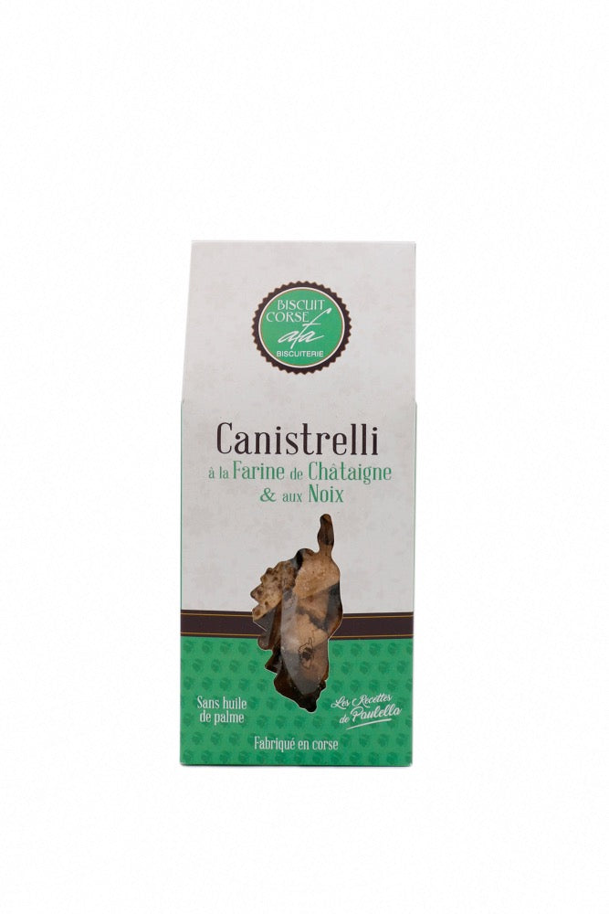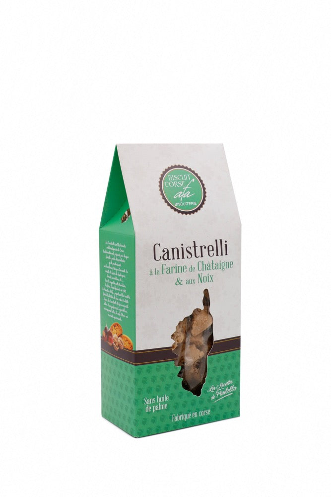 Une double cuisson apporte à ces biscuits traditionnels corses le croustillant caractéristique des canistrelli. La farine de châtaigne et les noix font de ce biscuit un des plus gourmands de la gamme.